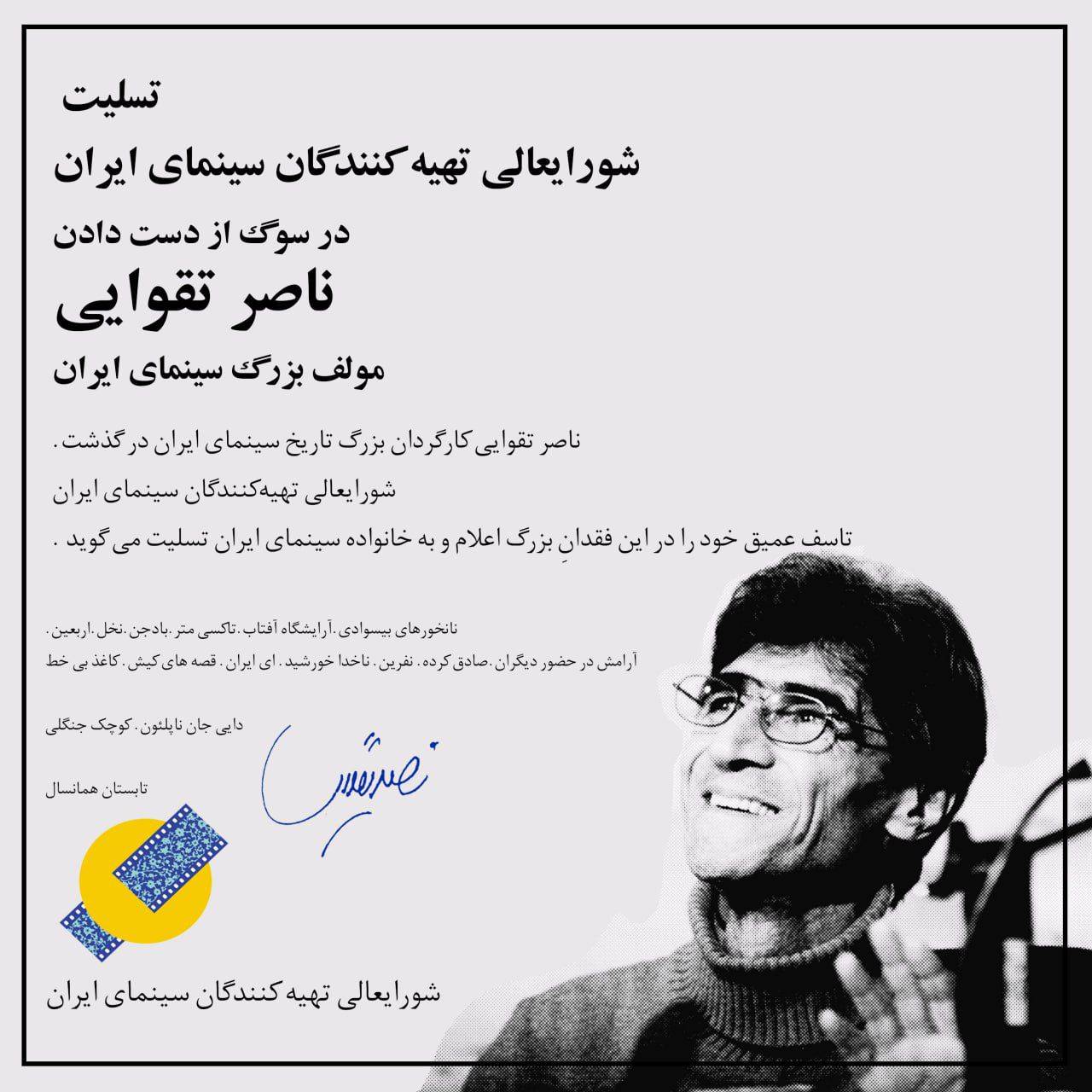 شورای عالی تهیه کنندگان سینمای ایران درگذشت «ناصر تقوایی» را تسلیت گفت. متن پیام بدین شرح است: