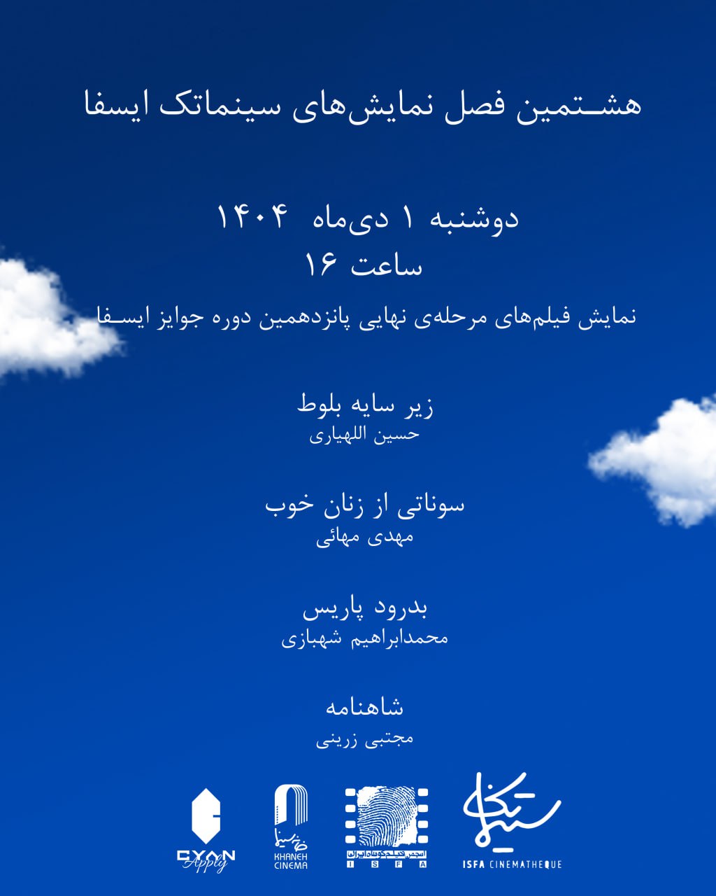 به گزارش روابط عمومی خانه سینما، ششمین جلسه از هفتمین فصل از نمایشهای سینماتک ایسفا به نمایش فیلمهای مرحله نهایی پانزدهمین دوره جوایز ایسفا اختصاص پیدا کرده است.