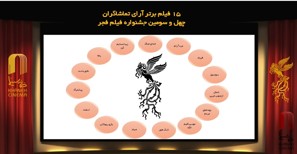 روابط عمومی خانه سینما نتیجه شمارش آرای فیلم های نمایش داده شده در روز پنجم جشنواره فیلم فجر (1403/11/16) توسط ستاد انتخاب فیلم برگزیده از نگاه تماشاگران جشنواره فیلم فجر اعلام کرد. لازم به توضیح است فهرست فیلم ها بدون اولویت است.
