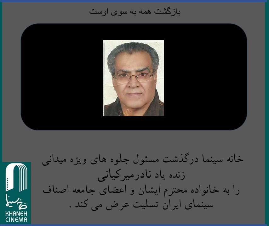 خانه سینما درگذشت پیشکسوت جلوه های ویژه میدانی زنده یاد نادر میرکیانی را به خانواده محترم ایشان و اعضای محترم جامعه اصناف سینمای ایران تسلیت عرض می کند. مراسم تشییع این هنرمند ارزشمند فردا سه شنبه ساعت 10 صبح در قطعه هنرمندان برگزار خواهد شد.