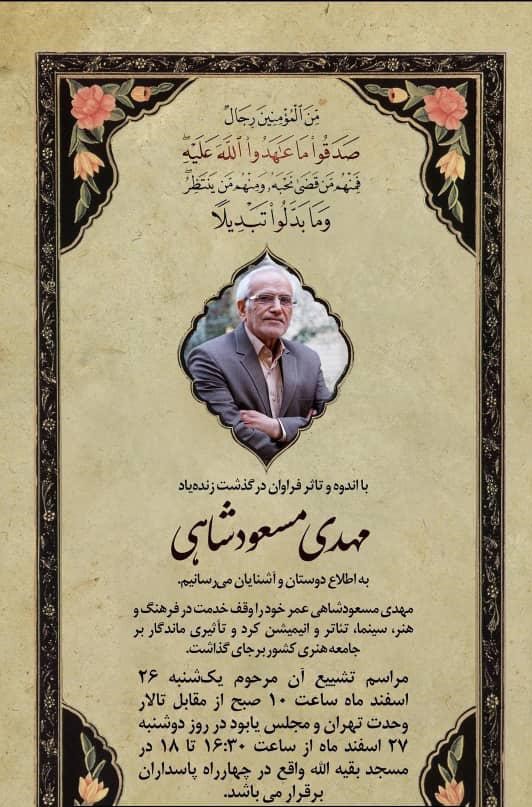 با اندوه و تأسف عمیق، درگذشت شخصیتی والا، مدیر فرهنگی برجسته و موسس نهادهای حمایتی از هنر و هنرمندان را اعلام میکنیم. مهدی مسعودشاهی عمر گرانبهای خود را وقف پرورش و تقویت منابع انسانی در حوزه هنر، سینما و انیمیشن کرده بود، تأثیری ماندگار بر جامعه هنری کشور برجای گذاشت.