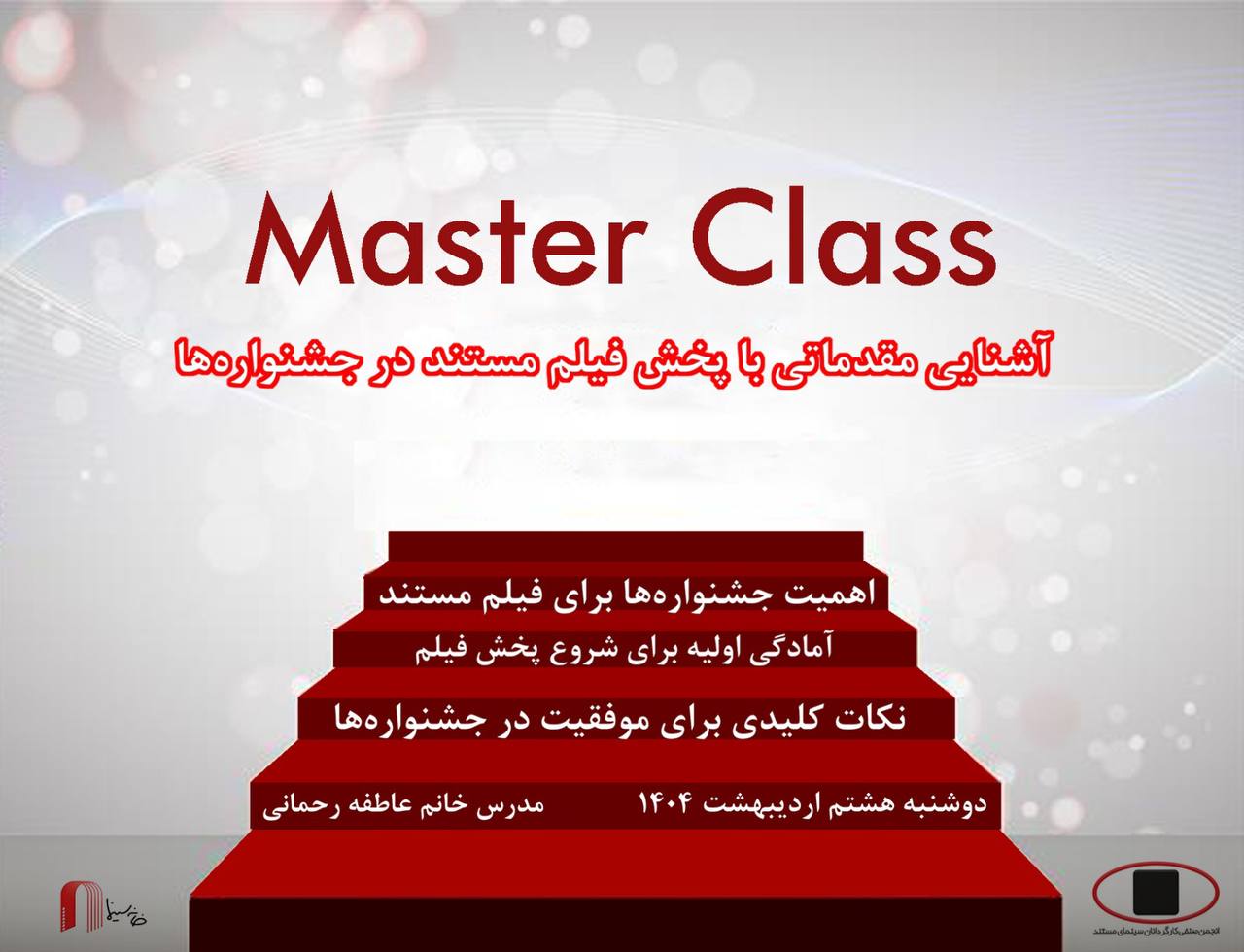 انجمن صنفی کارگردانان سینمای مستند، برای آشنایی هرچه بیشتر اعضای خود و همچنین، علاقهمندان به حضور در فستیوالهای جهانی فیلم، مسترکلاس تخصصی به شرح زیر برگزار میکند.